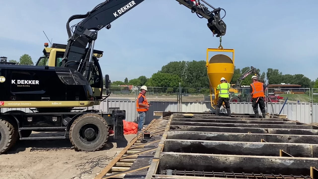Op de Elzenhagensingel maken we niet alleen een bijzondere brug, we hebben er ook een “betonfabriek op locatie” gecreëerd. Omdat we hier de ruimte hebben -zie je niet veel midden in Amsterdam!- maken we hier betonnen stootplaten voor andere projecten in Amsterdam Centrum en Rotterdam. Dit scheelt tijd en kosten. Onze nieuwste mobiele graafmachine zie je hier in actie om dit proces te assisteren: