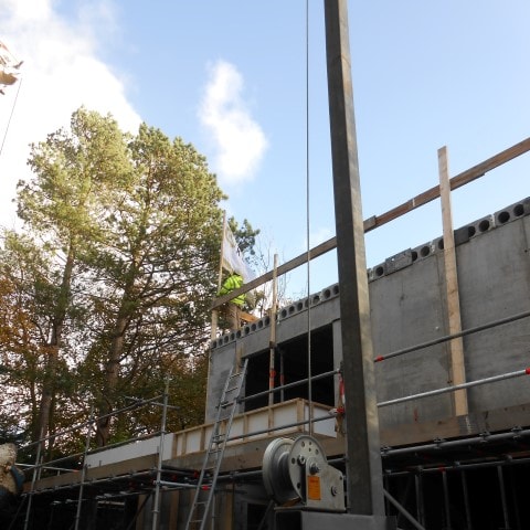 De constructie van de woning is grotendeels van beton. Doordat er grote, glazen schuifpuien in de woonkamer en keuken komen, waar het glas over verschillende hoeken doorloopt, zijn “zwevende” betonwanden boven de schuifpuien gemaakt. De betonwanden zijn aan de bovengelegen vloeren vast gestort, waaronder de kozijnen worden gemaakt. De kozijnen worden weggewerkt in het plafond en de vloer, waardoor er weinig speling is in de maatvoering. Een stukje extra uitdaging!
