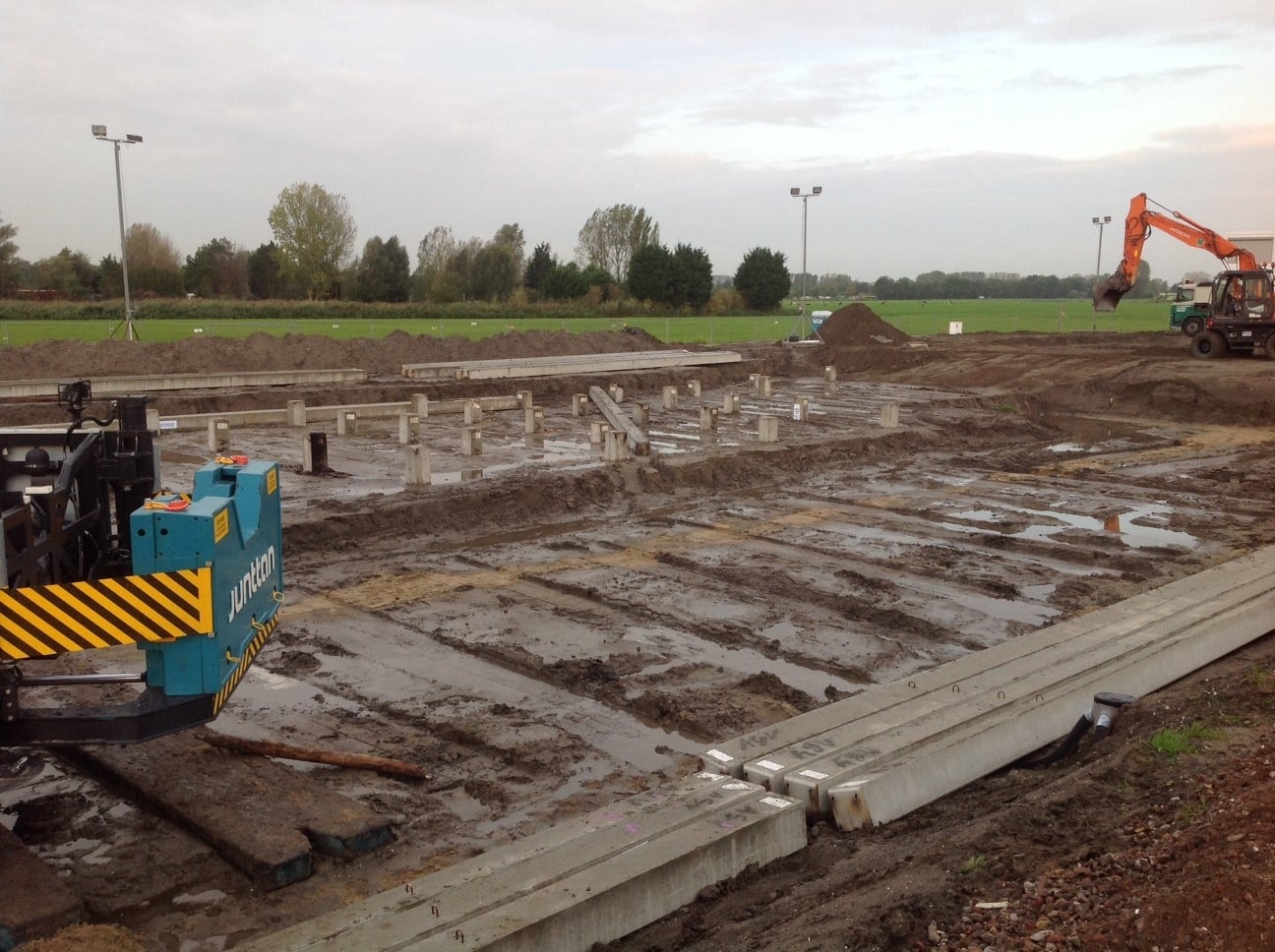 Het sloopwerk, heiwerk, grondwerk en funderingswerk is gereed. De vloer is monolithisch afgewerkt en klaar voor de staalconstructie.