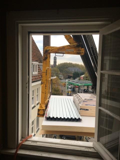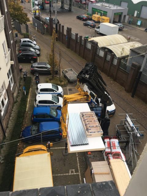 De locatie van het GVB waar de verbouwing is gerealiseerd is een moeilijk te bereiken plek met zeer beperkte bouwruimte. Opengebroken weg in de directe omgeving, wat het niet makkelijk maakte voor de toelevering van materiaal. “We hebben een beknopte materiaalplanning gemaakt, voor wat we wanneer nodig hebben. Er is maar drie keer in de hele bouwperiode materiaal aangeleverd en er was geen opslagruimte. We moesten hier dus een super strakke planning voor maken. Daarbij moest ook alles nog naar boven, omdat we vanaf de eerste verdieping werkten. Al het materiaal moest met een hijskraan omhoog” aldus vakman Dave Barendrecht.
