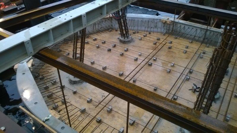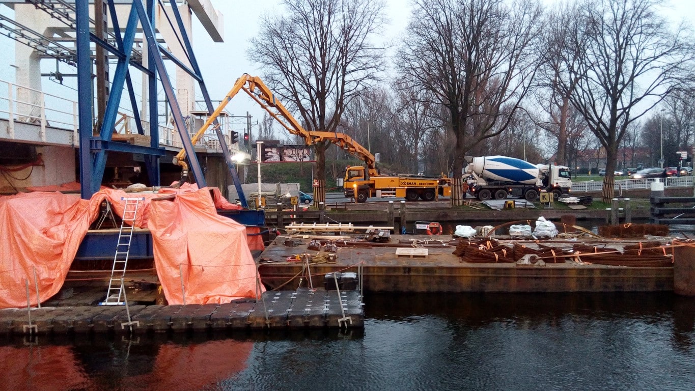 Na maanden hulpconstructies aanbrengen, installaties ombouwen, slopen en de definitieve fundering aanbrengen is het eindelijk zover, de eerste betonstort van de pijler Spaarnebrug is een feit. Door middel van een betonpomp vanaf de kant wordt met ruim 30 meter slang, welke door en over de hulpconstructie loopt, beton gestort. In verband met het verhardingsproces wordt het beton verwarmd in een tent, zodat na 10 dagen de volgende betonstort plaats kan vinden.