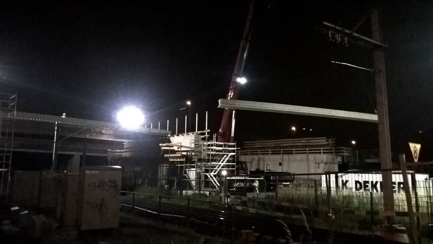 In Gouda is K_Dekker bouw & infra b.v. doende met het plaatsen van twee spoorviaducten aan de Parallelstructuur A12. Voor het plaatsten van de prefab liggers hebben onze medewerkers tussen de treinvrije uren (’s nachts) de prefab brugliggers geplaatst en gemonteerd.