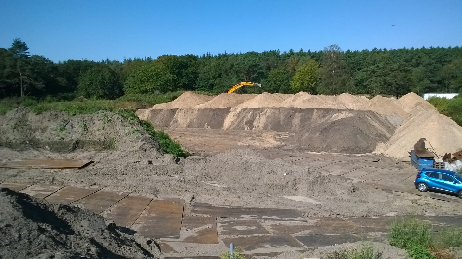 De aanlandingen zijn de “flauwe” opritten naar het ecoduct toe. Deze zijn ca. 100m1 lang en overbruggen het hoogteverschil tussen de hoge brug en de lager gelegen natuurgebieden die met elkaar worden verbonden. Op deze aanlandingen komt de inrichting van het terrein met hekwerken, stobbenwallen, fietspad, ruiterpad en ook beplanting. Als toplaag van de aanlandingen en het ecoduct maken we gebruik van de bestaande toplaag, die we eerst ontgraven. Dat is goed zien op de foto’s. De kernen van de aanlandingen worden gevuld met industriegrond, welke vrij komt bij diverse bouwprojecten uit de regio.