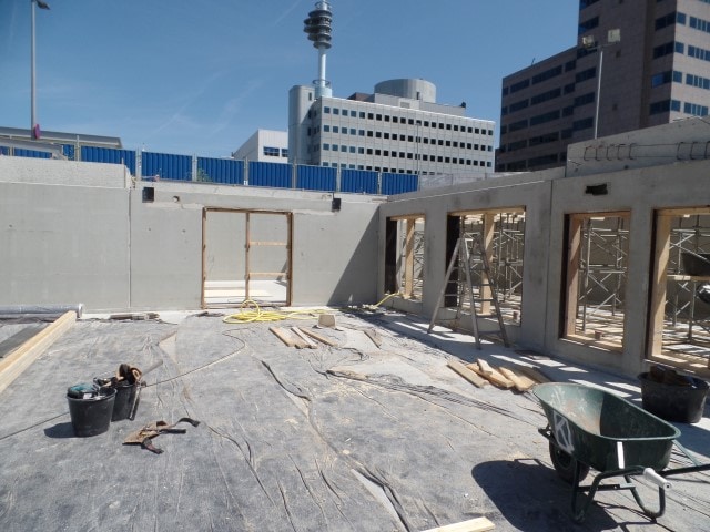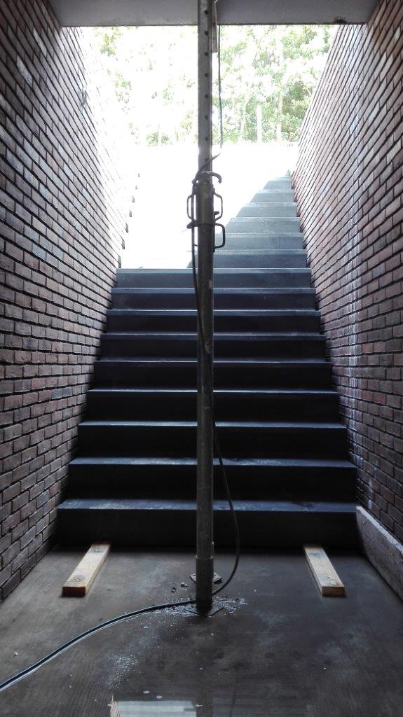 “Daarna hebben we het dak gerealiseerd d.m.v. prefab betonbalken met hierover heen zogenaamde “kanaalplaten”. Over de kanaalplaten heen is een druklaag (beton) gestort. Het dak van de uiteindelijke parkeergarage ligt onder afschot, om het water af te kunnen laten afvloeien. Het bouwkundige gedeelte, welke nu wordt uitgevoerd bevat onder andere technische installaties, lift, trappenhuis, wc ruimte etc.” vertelt Dick enthousiast.