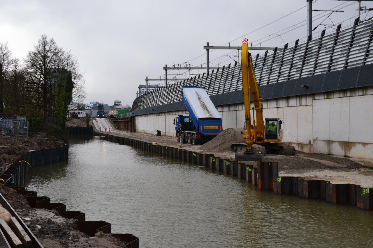Inmiddels zijn alle damwanden geplaatst die de kering vormen tussen de toekomstige busbaan en Kruisvaart .