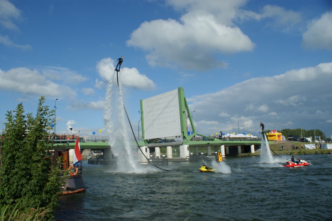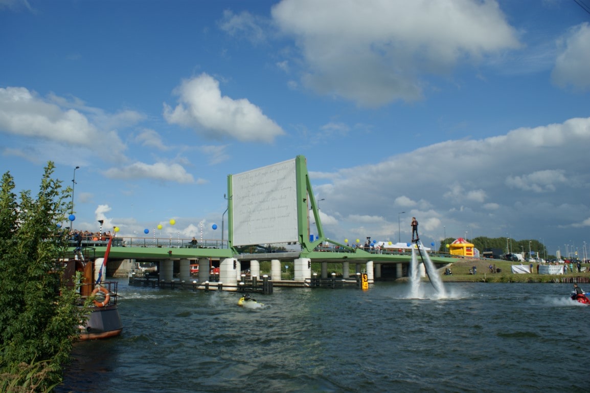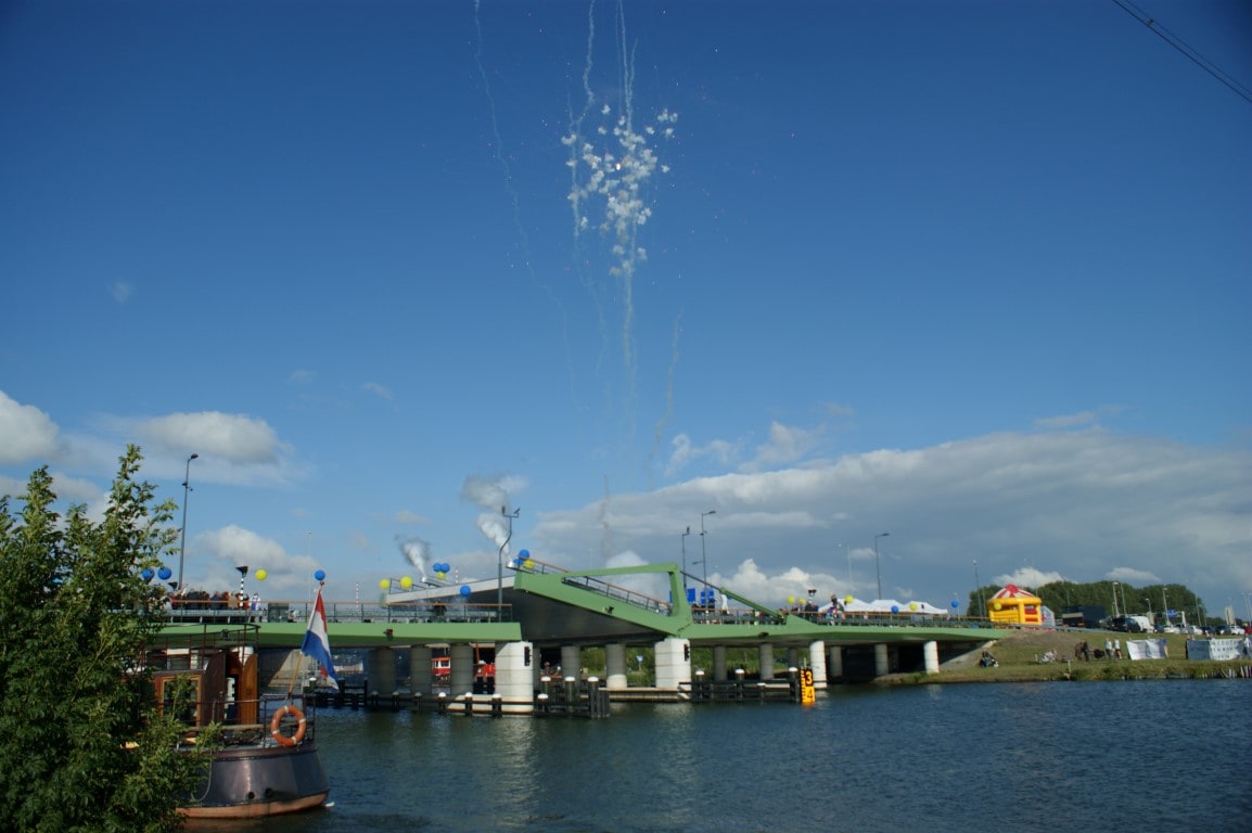 Het spectaculaire Flyboarding team reikte een symbolische Rode knop aan, waarmee de betrokken bestuurders het innoverende kunststoffen dek voor het eerst lieten zakken. Hiermee werd de brug geopend voor het verkeer. Aan de overzijde van de brug konden de belangstellenden onder genot van het gezang van ‘’de Meiden van de Kade’’ een borrel nuttigen.