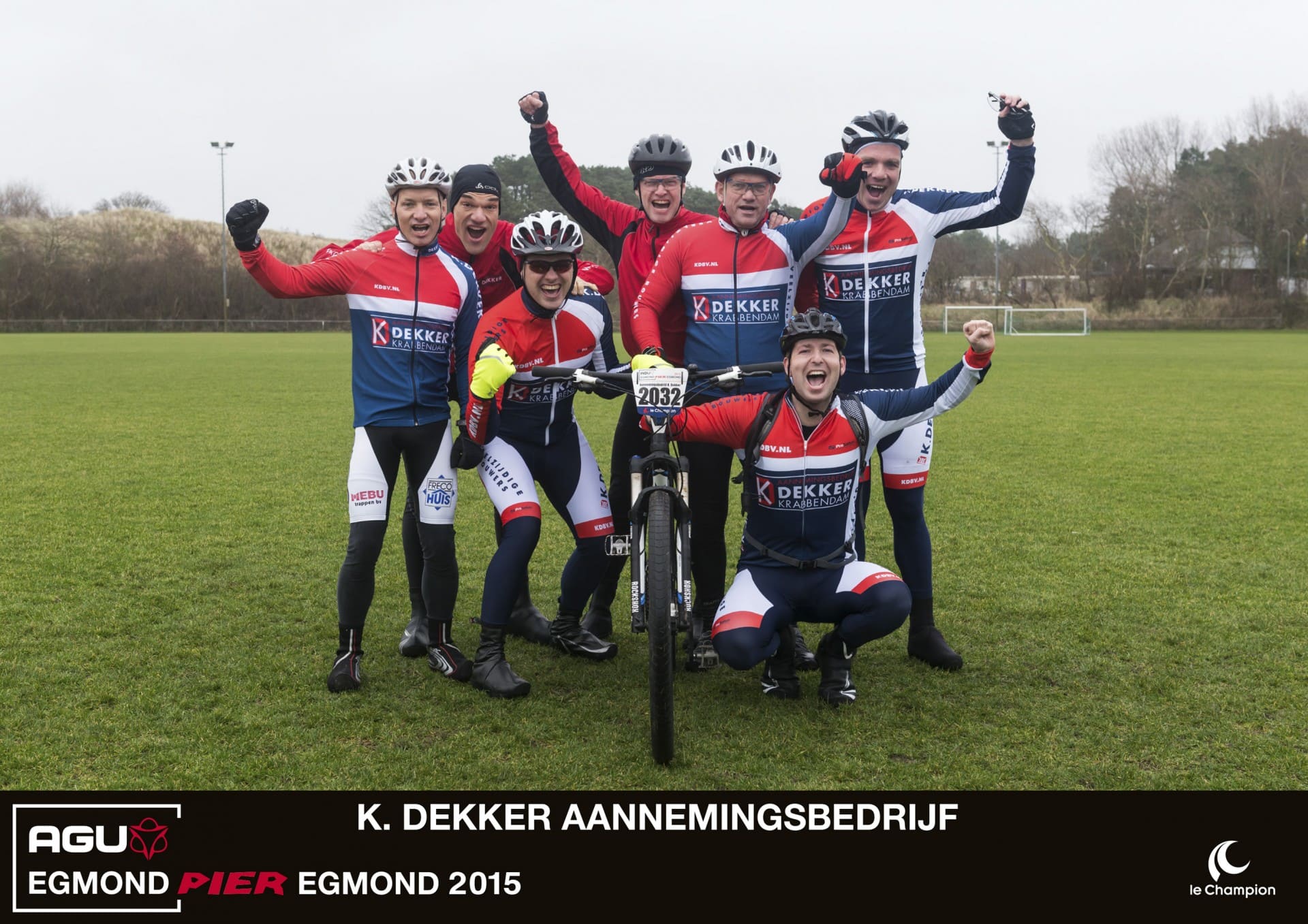 Afgelopen zaterdag 10 Januari 2015 werd de strandrace Egmond-Pier-Egmond verreden. Zoals ieder jaar was ook dit keer Aannemingsbedrijf K_Dekker bouw en infra weer vertegenwoordigd met een team. De wedstrijd wordt verreden vanaf Egmond over het strand tot aan de pier bij het Noordzee Kanaal te Velsen-noord en weer terug naar Egmond met een totaal van 36 kilometer. Door de wind welke met windkracht 8 (met windstoten van windkracht 10!) uit het westen waaide werd deze editie een van de zwaarste die ooit verreden is. De organisatie had de start al ruim een uur uitgesteld omdat het strand door de omstandigheden te smal was om de ruim 4000 deelnemers veilig de race te kunnen laten rijden. Vlak voor de start begon het te regenen. Deze bui veranderde tijdens de race in een zware hagelbui wat de omstandigheden nog zwaarder maakte. Na het keerpunt dachten de deelnemers de wind een klein beetje in de rug te hebben, echter doordat de wind draaide hadden de deelnemers zowel heen als terug de wind schuin tegen. Het enthousiasme van voor de start zoals op de foto te zien, was daarom na de race niet meer van de gezichten af te lezen. Echter s ’avonds na de race overheerste bij alle deelnemers een zeer voldaan gevoel. Dit werd nog eens versterkt toen alle deelnemers maandagochtend de complimenten kregen van de Dekker-collega’s. Wij kijken alweer uit naar volgend jaar!