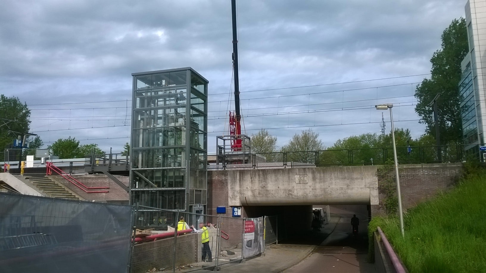 12 mei jl. is de laatste staalconstructie aangebracht ten behoeve van de nieuwe liften. Na vandaag zullen de liftschachten worden voorzien van beglazing, tegelwerk en de liftinstallatie. De planning is dat medio juli de reizigers gebruik kunnen maken van de nieuwe liften en trappartij.