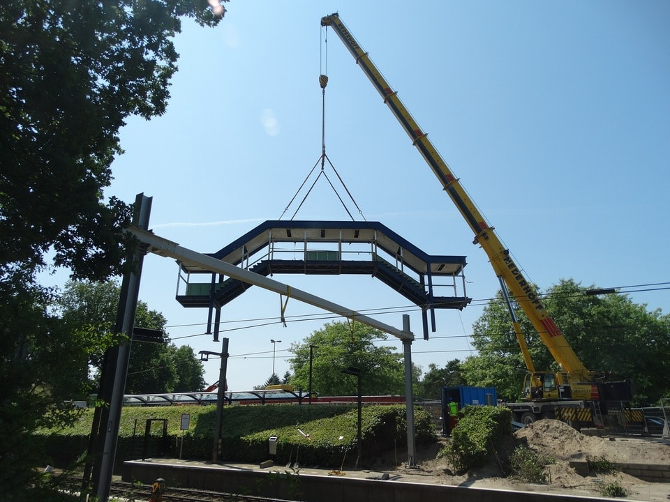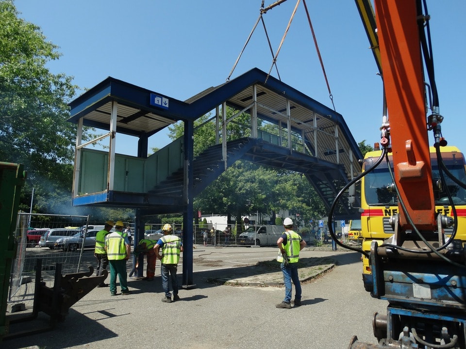 Na het “lossnijden” van de staalconstructie is de 16 ton wegende traverse van zijn fundament getild en op het naastgelegen parkeerterrein gedemonteerd. Na de ingebruikname van de nieuwe traverse op 19 juni jl., waren het verwijderen van de oude traverse en het aanpassen van de bovenleiding de laatste werkzaamheden op dit station.