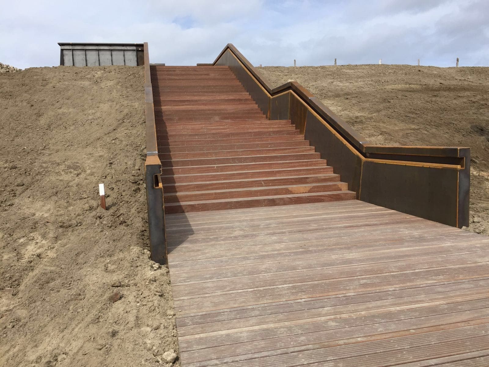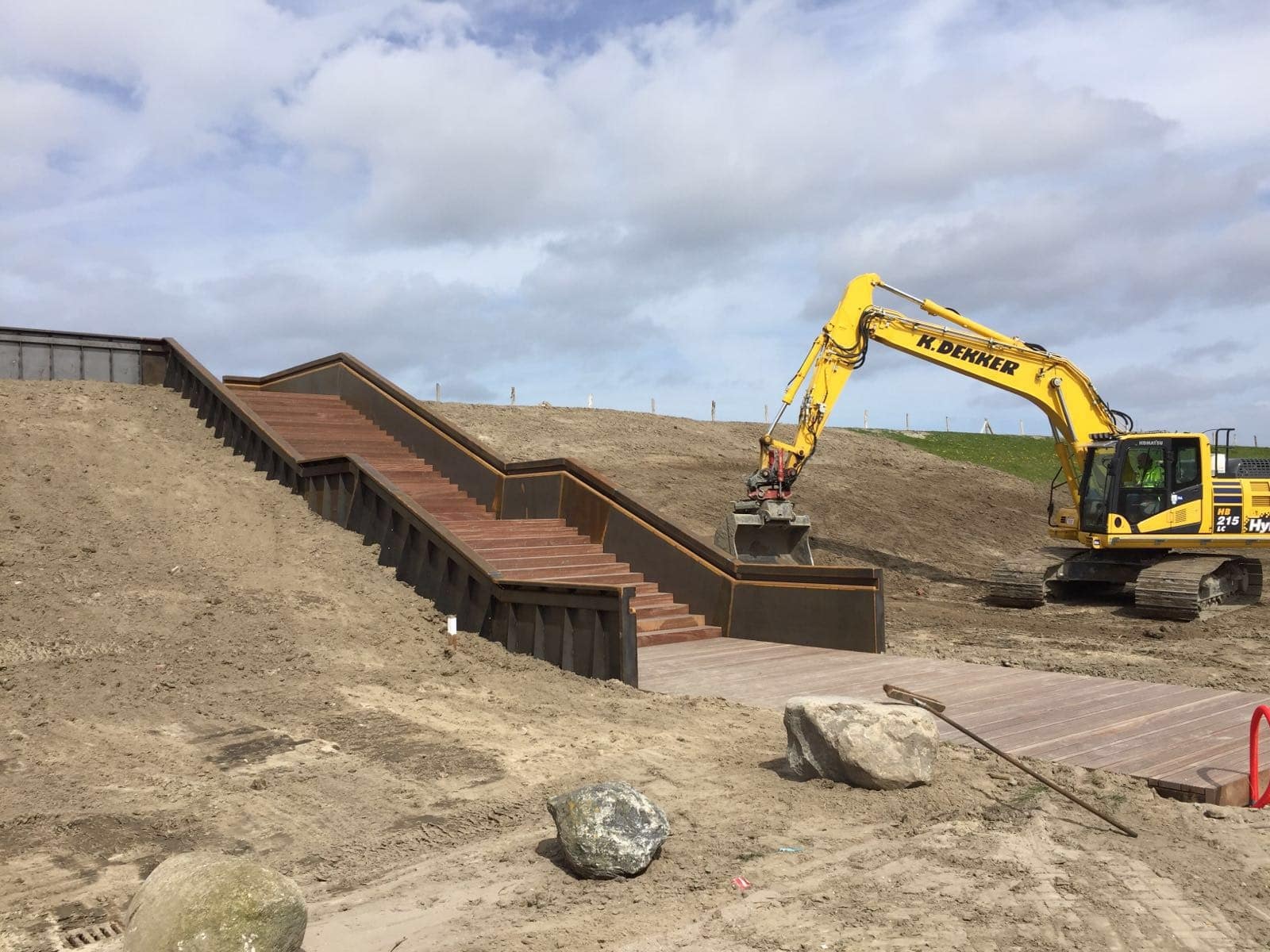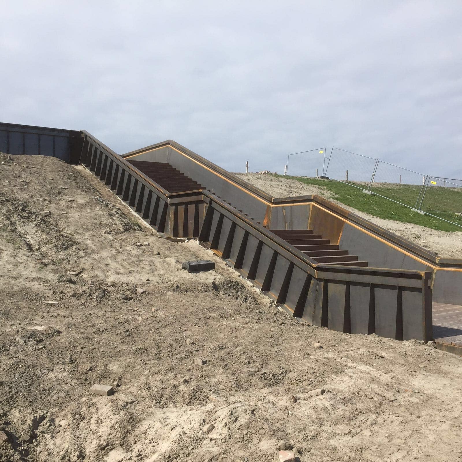 Vanuit Petten is het strand met twee nieuwe dijktrappen weer optimaal toegankelijk. K_Dekker realiseerde de robuuste strandopgangen die bestaan uit een mooie mix van cortenstalen leuningen, hardhouten traptreden en een betonnen fundering. Bestand tegen alle elementen!