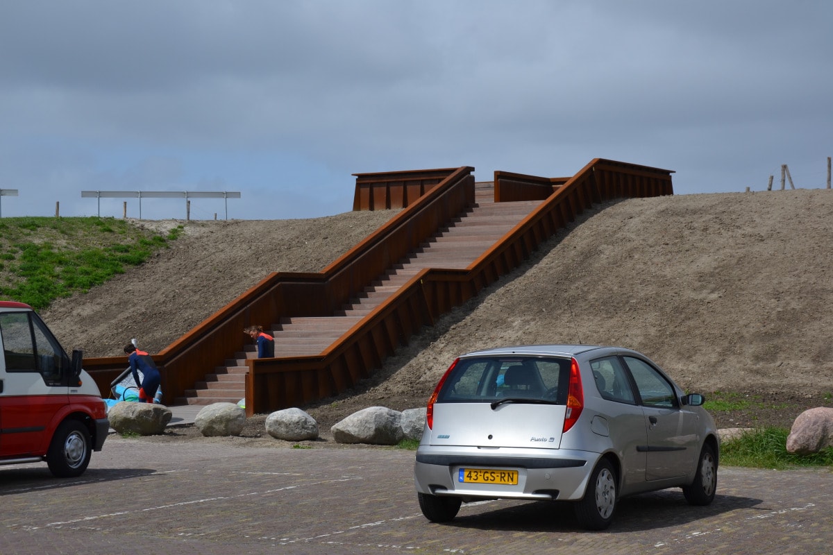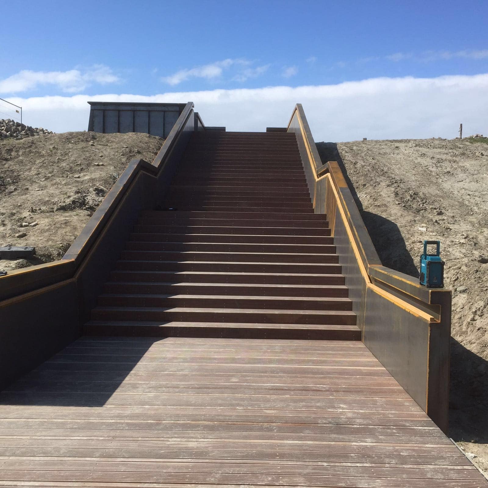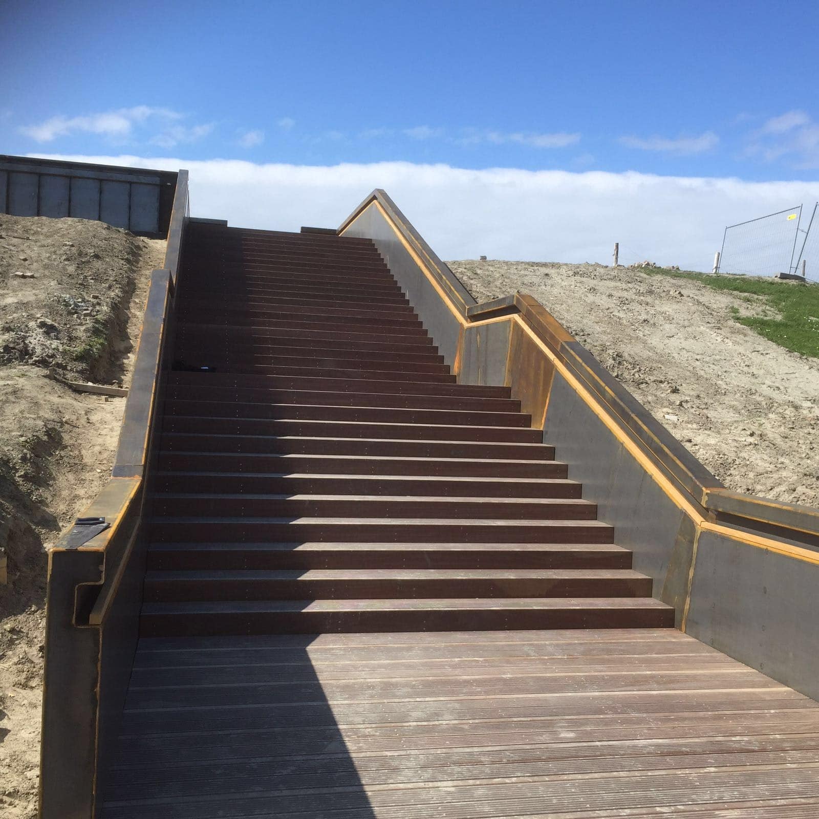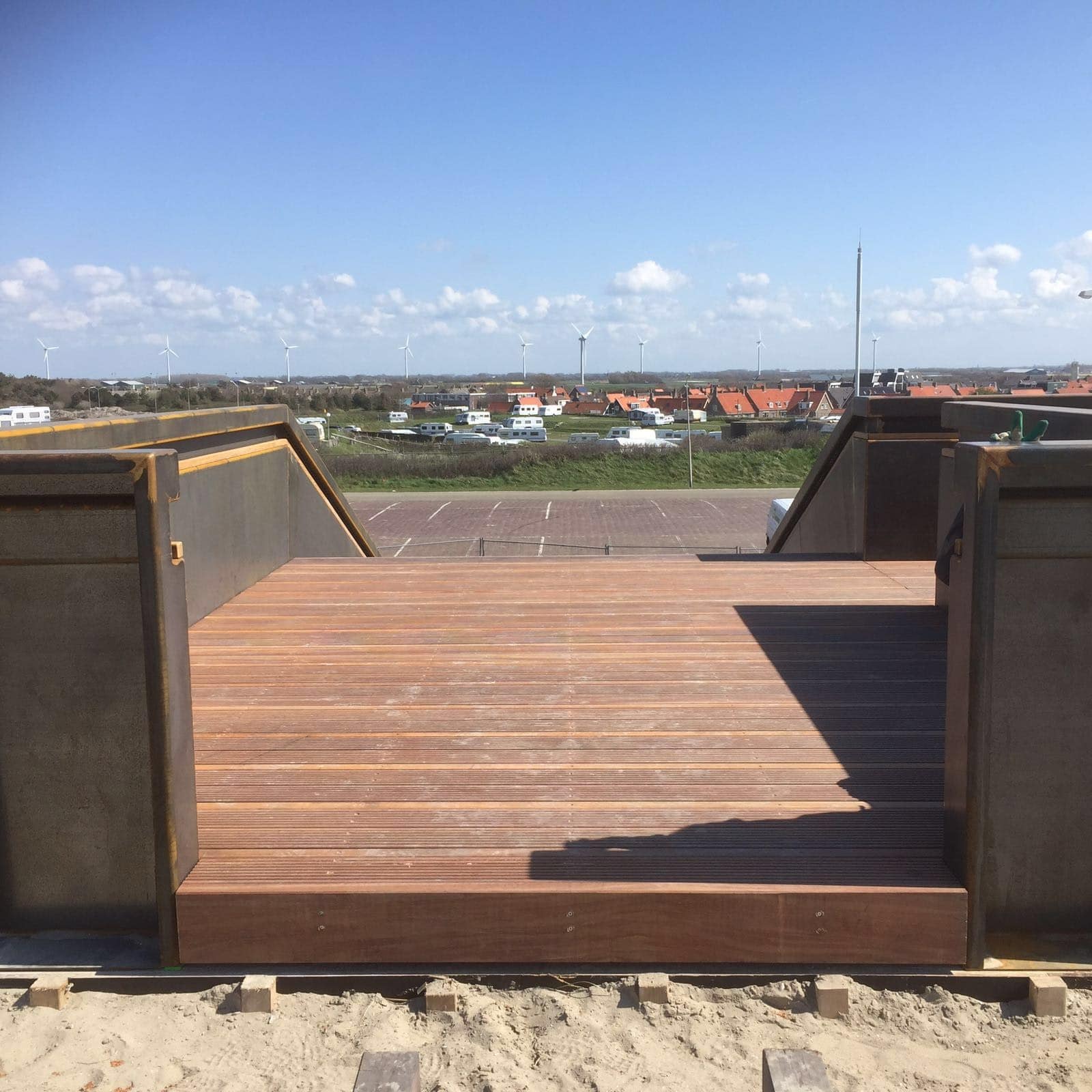 Vanuit Petten is het strand met twee nieuwe dijktrappen weer optimaal toegankelijk. K_Dekker realiseerde de robuuste strandopgangen die bestaan uit een mooie mix van cortenstalen leuningen, hardhouten traptreden en een betonnen fundering. Bestand tegen alle elementen!