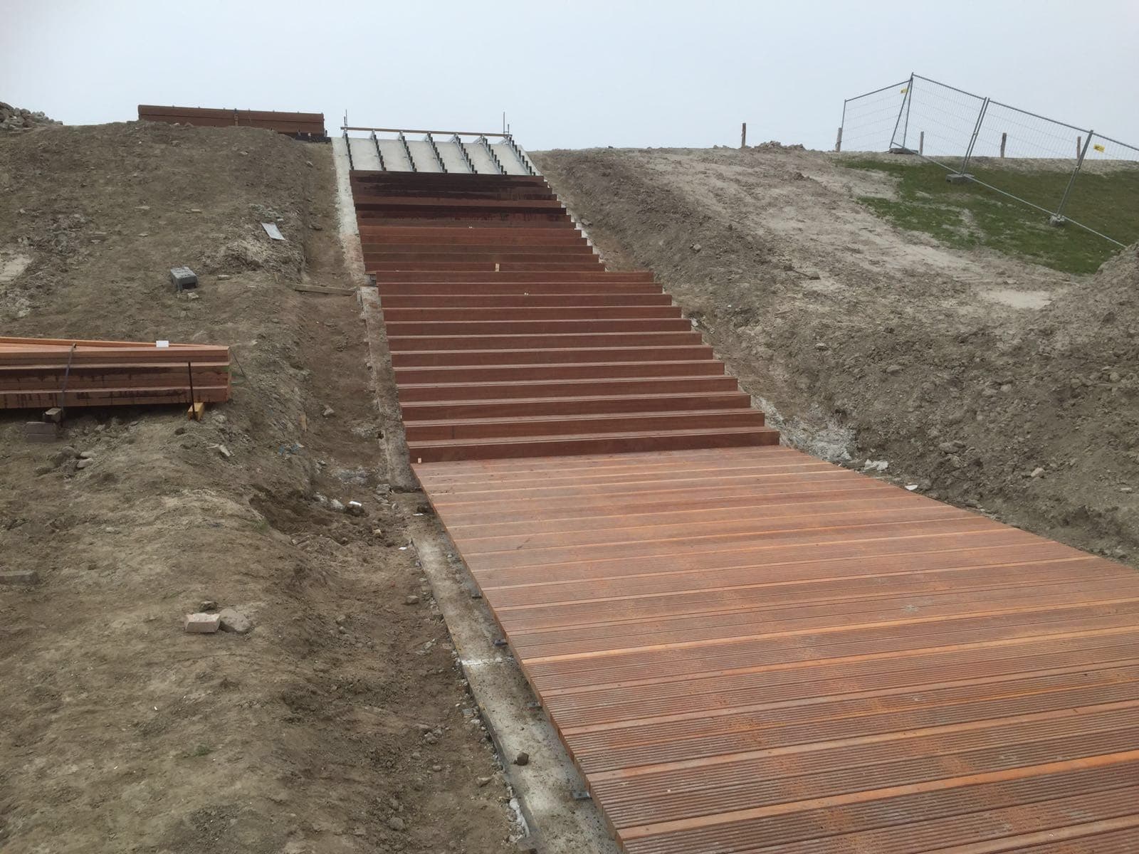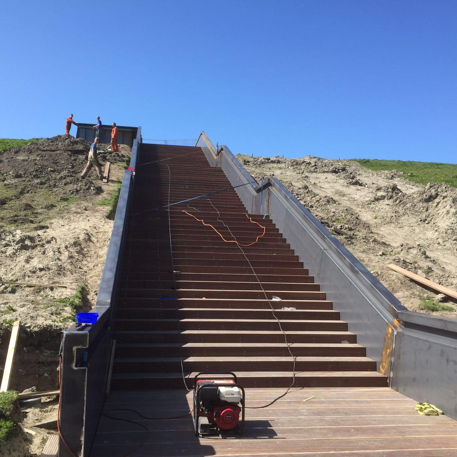 De fundering van de trappen bestaat uit een gewapend betonplaat, een stalen bovenbouw en ten slotte en hardhouten dek deel. De wanden van de trap bestaan uit gezet cortenstaal met een brede bovenzijde en een holte in de armleuning. In deze holte is een ledverlichting opgenomen om ook ’s avonds een goede zichtbare trap te hebben.