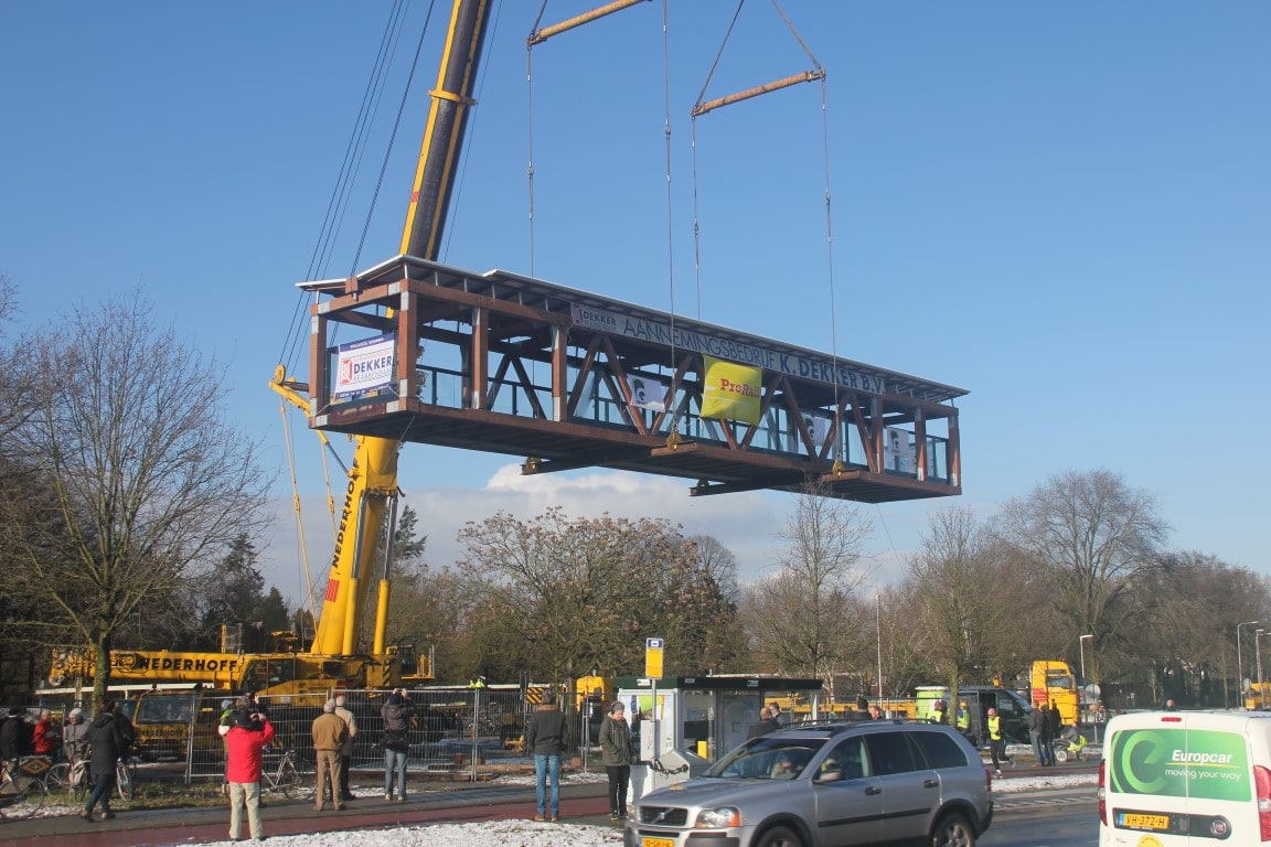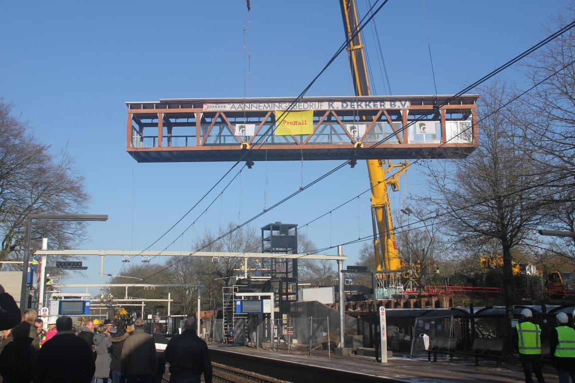 Afgelopen weekeinde heeft K_Dekker bouw en infra, in een buitendienststelling van 50 uur, de 28 meter lange azobé houten traverse over het spoor gehesen. Om de traverse te kunnen plaatsen en het perron beter toegankelijk te maken, zijn diverse aanpassingen aan de bovenleidingen gedaan. Dankzij het zonnige en windstille weer verliep het plaatsen van de traverse voorspoedig. Ook konden de bezoekers, die in groten getale aanwezig waren, genieten van het schouwspel onder het genot van een door ProRail ter beschikking gesteld kopje koffie, thee of snert. We zijn erg trots op dit stukje vakwerk en willen alle mensen van ProRail, onderaannemers, collega’s en omwonenden bedanken voor de interesse. Het team was erg overdonderd door het aantal toeschouwers. De trappen, liften en abri’s worden afgebouwd en dan is ook dit station toegankelijk voor mindervaliden!