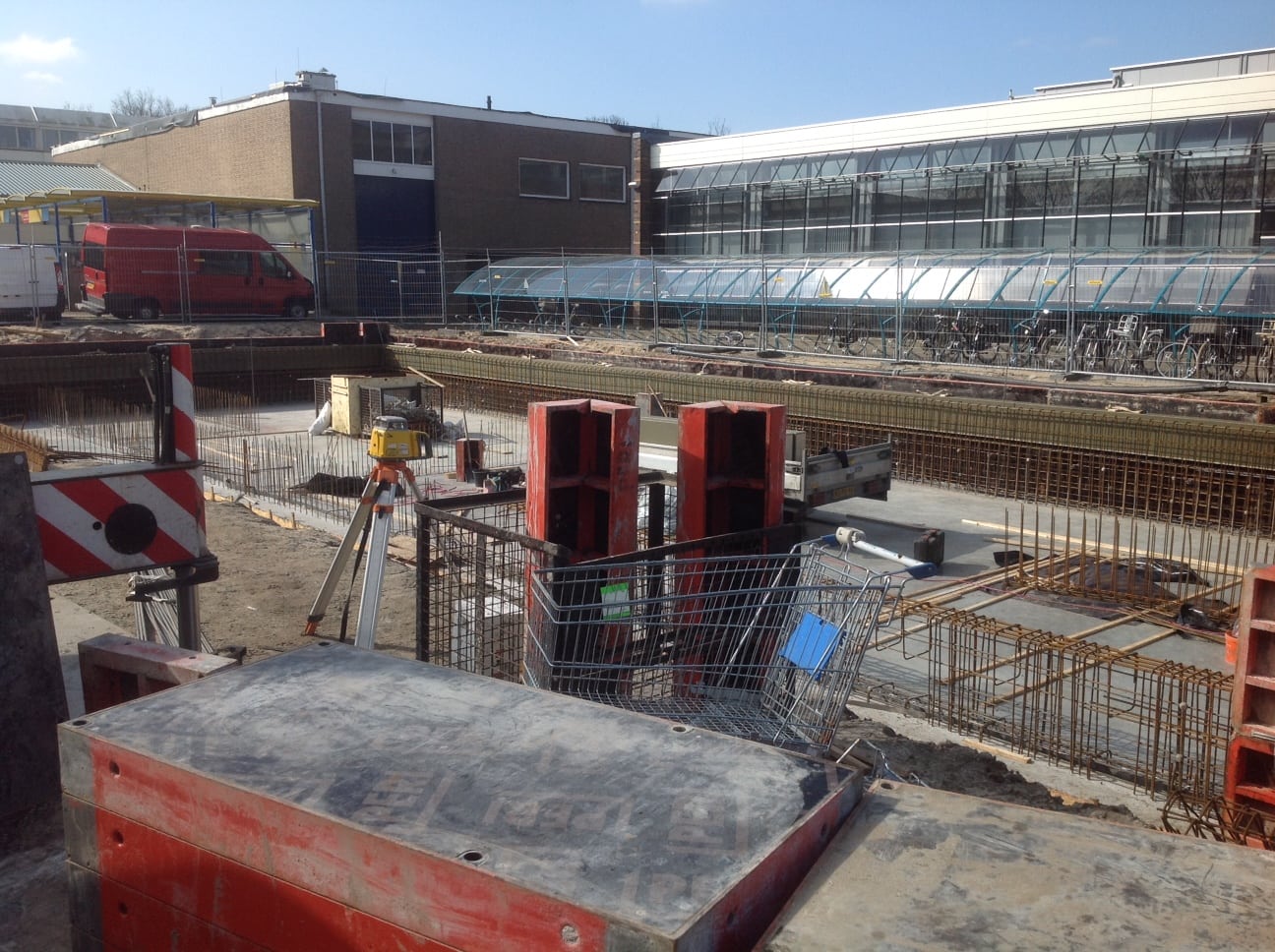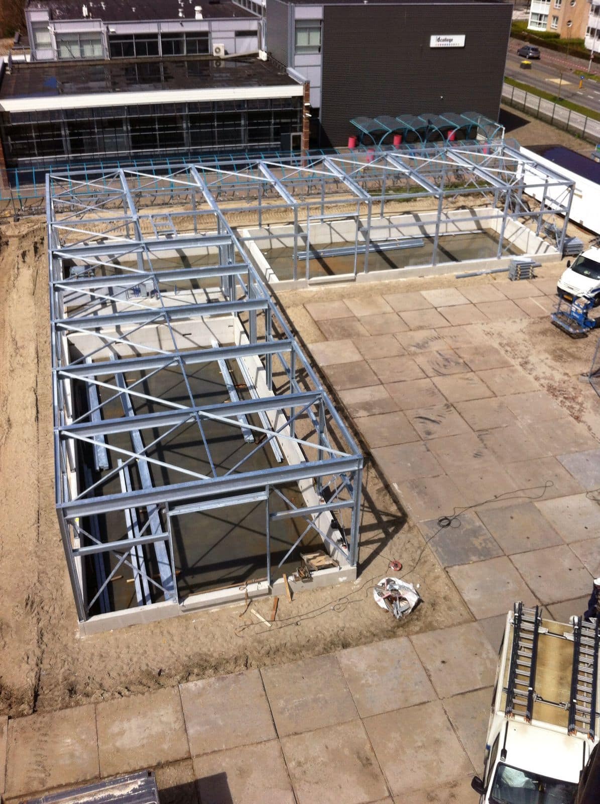 Momenteel is de stalen hoofddraagconstructie op de betonnen kelderbak constructie geplaatst.