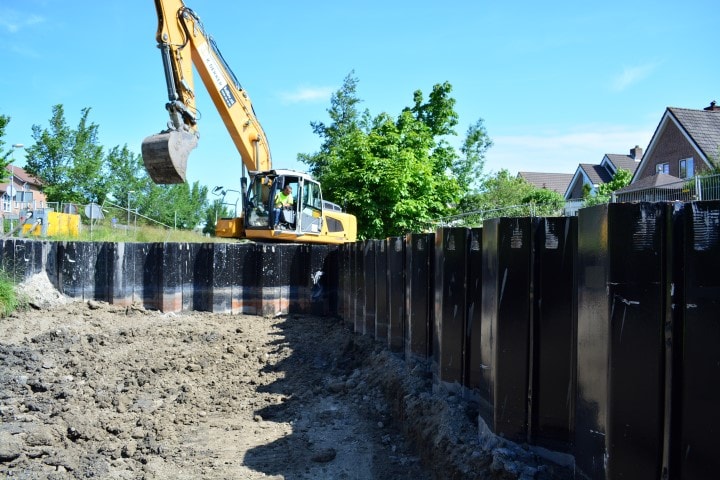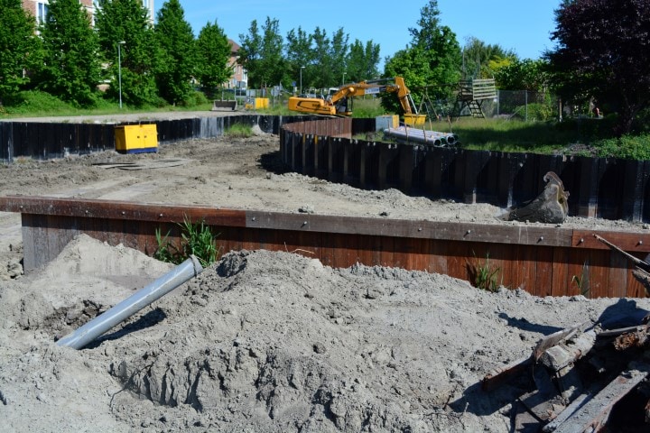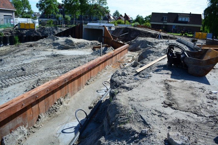K_Dekker realiseert de aanleg van de twee duikers en er wordt een damwand langs de Tjalk en het Bindingspad geslagen om het verhoogde waterpeil op te kunnen vangen. Deze zijn inmiddels volledig aangebracht en hiermee krijgt het project echt vorm. Momenteel worden de houten damwandvleugels, betonnen deksloof en schanskorf aangebracht. Als dit gereed is, worden de privé tuinen aangelegd.