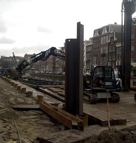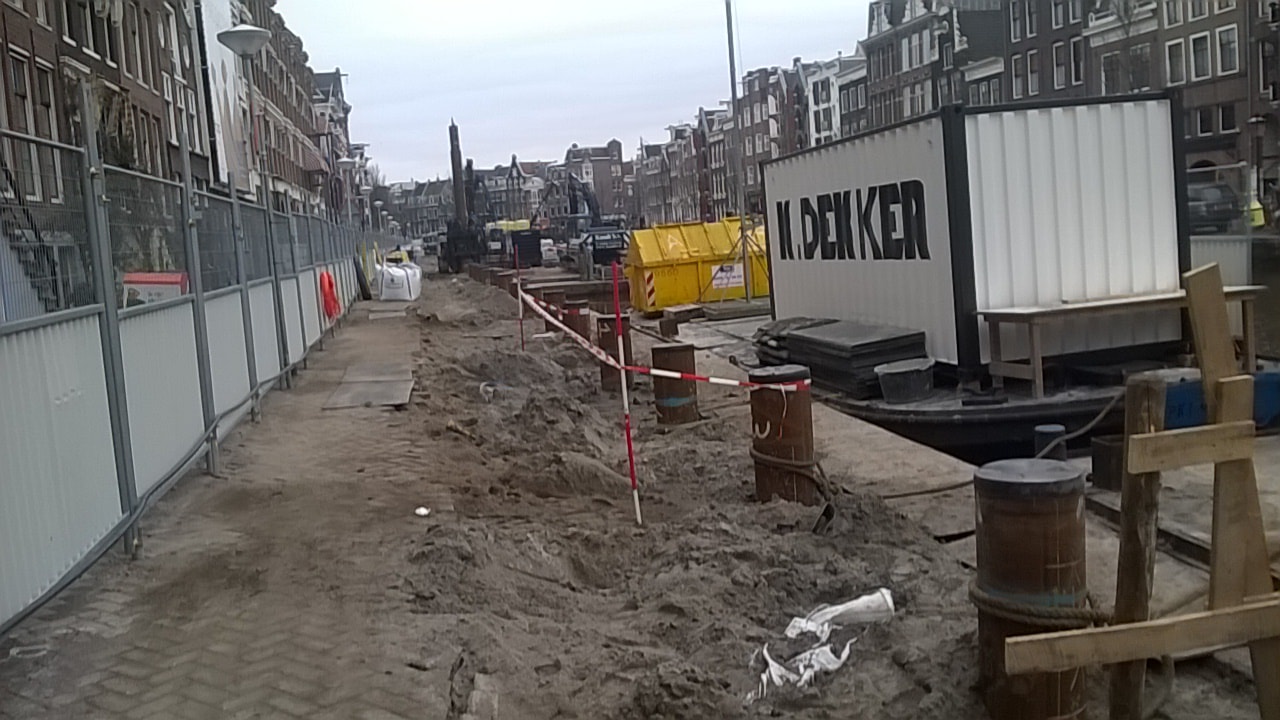 Aan de Prinsengracht Amsterdam vervangt K_Dekker bouw & infra b.v. 200 meter kademuur. Momenteel zijn we bezig met het crushen en drukken van de damwanden. Dit gebeurt op een trillingvrije manier, zodat er geen schade ontstaat aan de kade en de omliggende (monumentale) woningen. Door middel van een crushpaal wordt een gat in huidige kademuur en houten vloer geboord, waarna de funderingspalen geboord en de damwanden gedrukt worden. Deze methode wordt voor het eerst toegepast op een drukke locatie midden in het centrum van Amsterdam. Een ander speciaal aspect aan dit project is dat al het materieel wordt aangevoerd vanaf het water om zo min mogelijk hinder te vormen voor de omgeving.